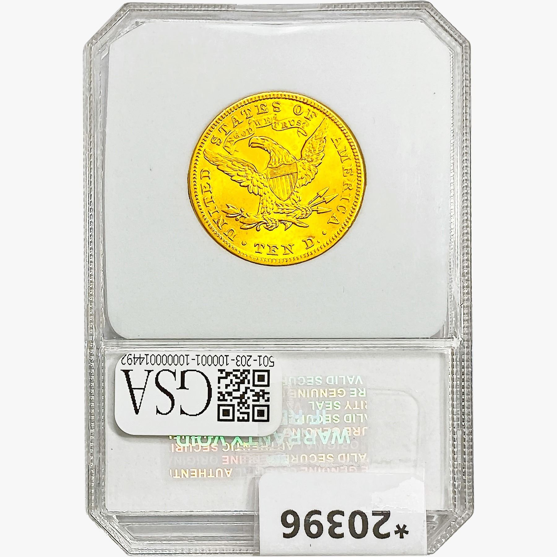 l. All non-certified coins and currency are guaranteed genuine, but are not guaranteed as to grade, since grading is a matter of opinion, an art and not a science, and therefore the description rendered by GSA or any third-party grading service may not agree with the opinion of others (including trained experts), and the same expert may not grade the same item with the same grade at two different times. GSA may, but is not obligated to, express an opinion as to non-certified numismatic items, in GSA's opinion, or by its employees' experience and the current interpretation of the American Numismatic Association's standards as of the date the catalog was prepared. There is no guarantee or warranty expressed or implied that the grading opinions utilized by GSA, if any, will meet the standards of any grading service at any time in the future.