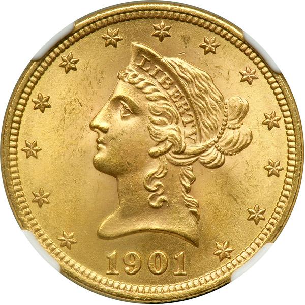 1901 $10 Liberty. NGC graded MS-65. Boldly struck and bascially untoned. Strikingly brilliant throughout, in fact, with no deep abrasions present to sidetrack your enjoyment of the smooth surface and fresh Gem-quality golden color.Pop 617; 72 finer (PCGS # 8747) .