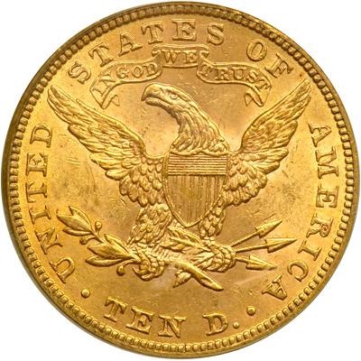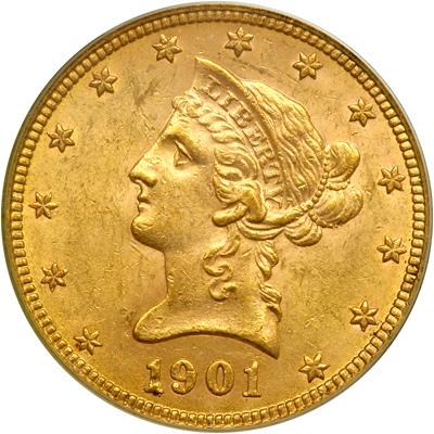 1901 $10 Liberty. PCGS graded MS-62. Exhibits subdued golden tones (PCGS # 8747) .