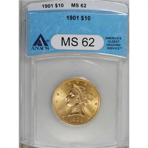 <B>1901 $10 MS62 ANACS.</B></I> NGC Census: (6071/7542). PCGS Population (4468/4648). Mintage: 1,718,825. Numismedia Wsl. Price for NGC/PCGS coin in MS62: $395. (#8747)<BR><BR><B>Coin Engraver:</B> Christian Gobrecht<BR><BR><b>Shipping:</b> Coins & Currency (<a target="_blank" href="http://www.heritageauctions.com/common/shipping.php">view shipping information</a>)