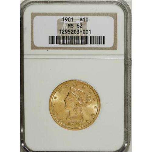 <B>1901 $10 MS62 NGC.</B></I> NGC Census: (6044/7522). PCGS Population (4458/4602). Mintage: 1,718,825. Numismedia Wsl. Price for NGC/PCGS coin in MS62: $380. (#8747)<BR><BR><B>Coin Engraver:</B> Christian Gobrecht<BR><BR><b>Shipping:</b> Coins & Currency (<a target="_blank" href="http://www.heritageauctions.com/common/shipping.php">view shipping information</a>)