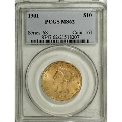 <B>1901 $10 MS62 PCGS.</B></I> PCGS Population (4491/4686). NGC Census: (6224/7674). Mintage: 1,718,825. Numismedia Wsl. Price for NGC/PCGS coin in MS62: $440. (#8747)<BR><BR><B>Coin Engraver:</B> Christian Gobrecht<BR><BR><b>Shipping:</b> Coins & Currency (<a target="_blank" href="http://www.heritageauctions.com/common/shipping.php">view shipping information</a>)