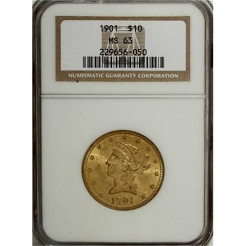 <B>1901 $10 MS63 NGC.</B></I> NGC Census: (4908/2721). PCGS Population (3027/1650). Mintage: 1,718,825. Numismedia Wsl. Price for NGC/PCGS coin in MS63: $820. (#8747)<BR><BR><B>Coin Engraver:</B> Christian Gobrecht<BR><BR><b>Shipping:</b> Coins & Currency (<a target="_blank" href="http://www.heritageauctions.com/common/shipping.php">view shipping information</a>)
