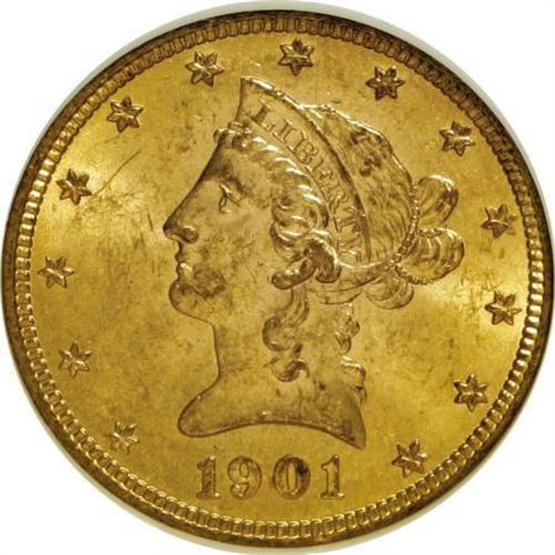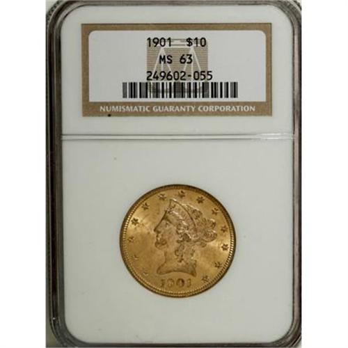 <B>1901 $10 MS63 NGC.</B></I> NGC Census: (4908/2721). PCGS Population (3027/1650). Mintage: 1,718,825. Numismedia Wsl. Price for NGC/PCGS coin in MS63: $820. (#8747)<BR><BR><B>Coin Engraver:</B> Christian Gobrecht<BR><BR><b>Shipping:</b> Coins & Currency (<a target="_blank" href="http://www.heritageauctions.com/common/shipping.php">view shipping information</a>)