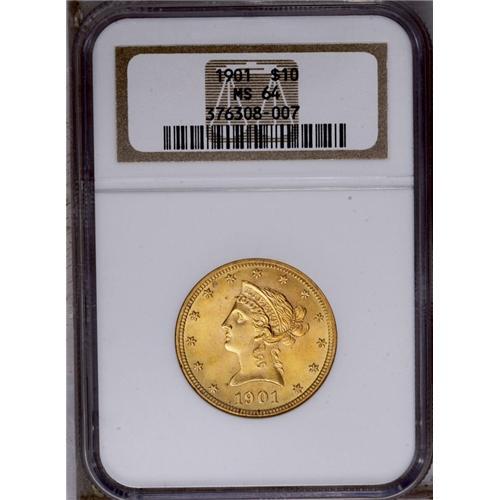 <B>1901<$10> MS64 NGC.</B></I> A lustrous honey-gold near-Gem that possesses a penetrating strike and attractive eye appeal. No marks of consequence can be located.