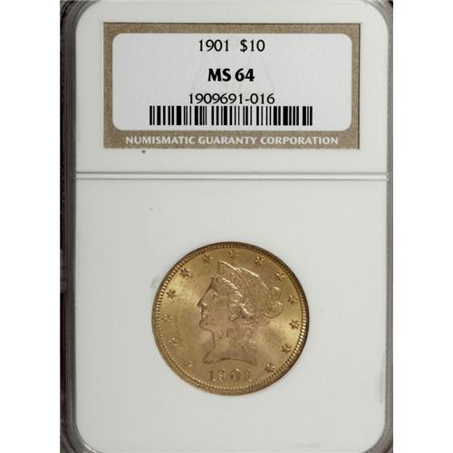 <B>1901 $10 MS64 NGC.</B></I> Highly lustrous with pleasing detail overall and only a handful of light marks. The glowing surfaces are predominantly orange-gold with a hint of yellow. An attractive Choice example of this popular type issue.<BR><BR><b>Shipping:</b> Coins & Currency (<a target="_blank" href="http://www.heritageauctions.com/common/shipping.php">view shipping information</a>)