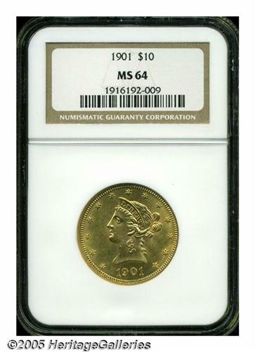 <B>1901<$10> MS64 NGC.</B></I> Radiant luster emanates from brass-gold surfaces that display just a mild splattering of contact marks. The design features are well struck, though the hair over Liberty's ear is a trifle soft.