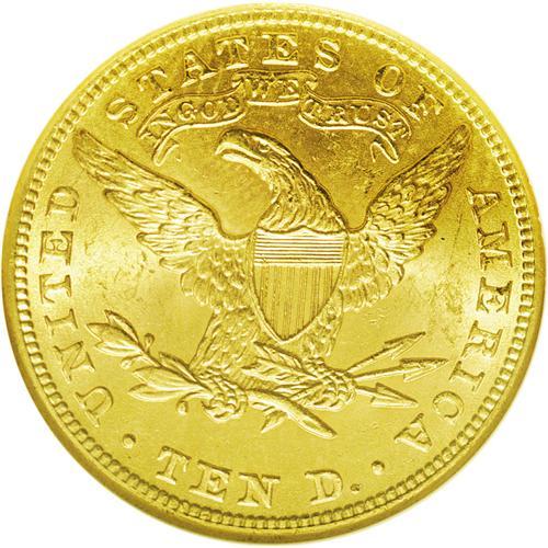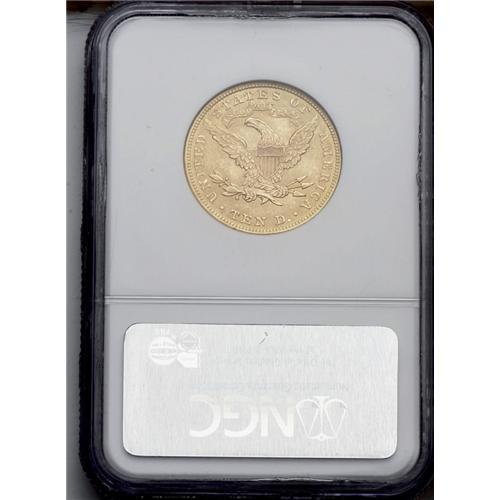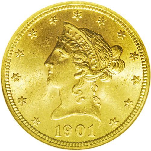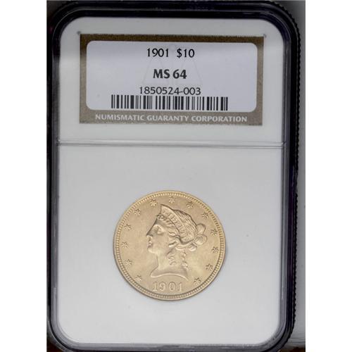 <B>1901<$10> MS64 NGC.</B></I> The 1901 ten dollar is relatively available through near-Gem, but becomes more difficult in higher grades. This MS64 specimen displays apricot-gold patination imbued with whispers of light tan. The design elements are sharply impressed throughout, with no areas revealing hints of weakness. The surfaces exude nice luster, and just a few minute contact marks and scuffs limit the grade. A pleasing overall specimen.