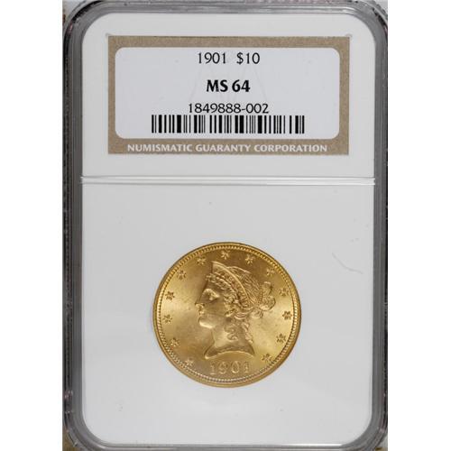 <B>1901 $10 MS64 NGC.</B></I> This boldly struck Choice Liberty eagle has clean fields and only minor contact on the portrait. The blended almond-gold and olive toning confirms the originality.<BR><BR><b>Shipping:</b> Coins & Currency (<a target="_blank" href="http://www.heritageauctions.com/common/shipping.php">view shipping information</a>)