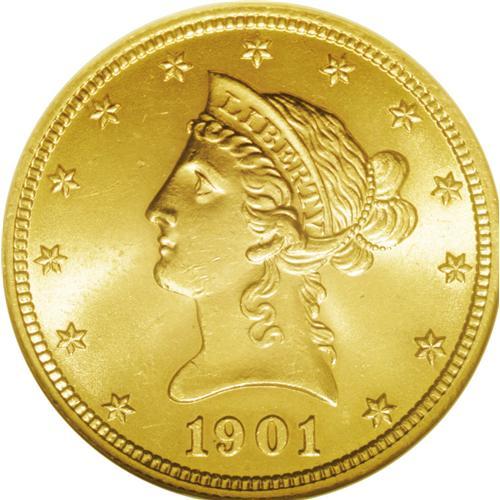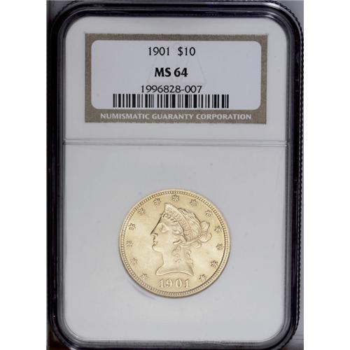 <B>1901<$10> MS64 NGC.</B></I> This high quality gold type coin is sharply struck and fully lustrous. Even more important, neither side has noticeable marks. The fields, in particular, are refreshingly clean. The 1901 is a plentiful date within the series, but exemplary examples remain prized in the marketplace.