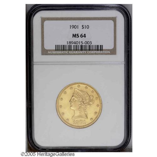 <B>1901<$10> MS64 NGC.</B></I> Well struck and very close to the Gem designation with a few limiting marks to the left of Liberty's nose. Otherwise outstanding for the grade with a bold strike and strong luster.