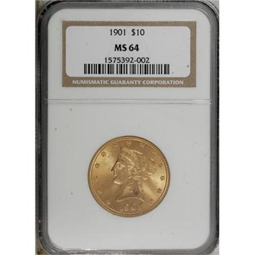 <B>1901 $10 MS64 NGC.</B></I> This well struck sun-gold Liberty eagle has unencumbered luster and good eye appeal. Clean for the grade aside from an inconspicuous abrasion on Liberty's shoulder.<BR><BR><b>Shipping:</b> Coins & Currency (<a target="_blank" href="http://www.heritageauctions.com/common/shipping.php">view shipping information</a>)