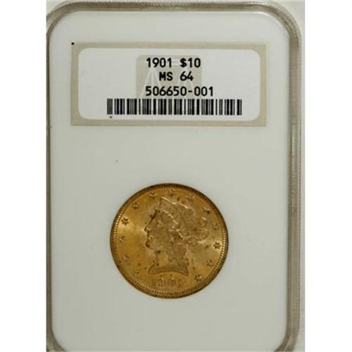 <B>1901 $10 MS64 NGC.</B></I> Blazing luster illuminates this well struck and attractive olive-gold Liberty type coin. The reverse is beautifully preserved, and no obverse marks require individual mention. In a prior generation holder.<BR><BR><B>Coin Engraver:</B> Christian Gobrecht<BR><BR><b>Shipping:</b> Coins & Currency (<a target="_blank" href="http://www.heritageauctions.com/common/shipping.php">view shipping information</a>)
