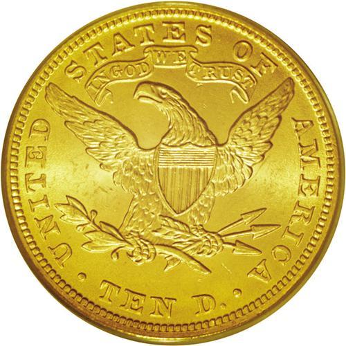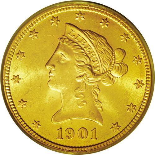 <B>1901<$10> MS64 PCGS.</B></I> The 1901 ten dollar is easily obtainable through MS64, and even occurs in Gem with some regularity. Walter Breen (1988) notes that a hoard of hundreds of Uncs showed up in the 1950s. The near-Gem offered here displays apricot-gold surfaces with traces of light green, and exhibits sharp definition on the design features. Minute marks on Liberty's cheek defines the grade.