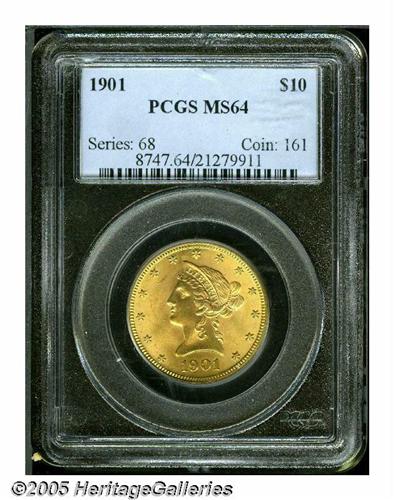 <B>1901<$10> MS64 PCGS.</B></I> This is a lovely example that has a noticeable glow in the fields, and greenish-gold patina throughout. The overall technical quality is quite impressive for a gold coin of this size. Sharply struck with a pleasing overall appearance.
