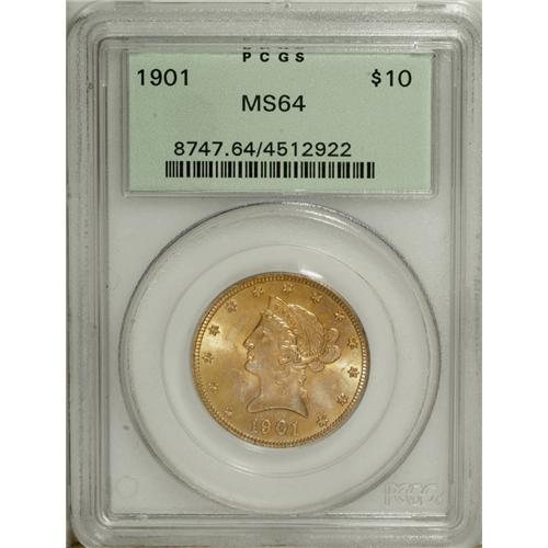 <B>1901 $10 MS64 PCGS.</B></I> This specimen is characterized by its extremely sharp strike and mellow orange-gold patina. This is a most appealing example of this date, perfectly suited for the Liberty type specialist.<BR><BR><b>Shipping:</b> Coin/Currency (<a target="_blank" href="http://www.heritageauctions.com/common/shipping.php">view shipping information</a>)