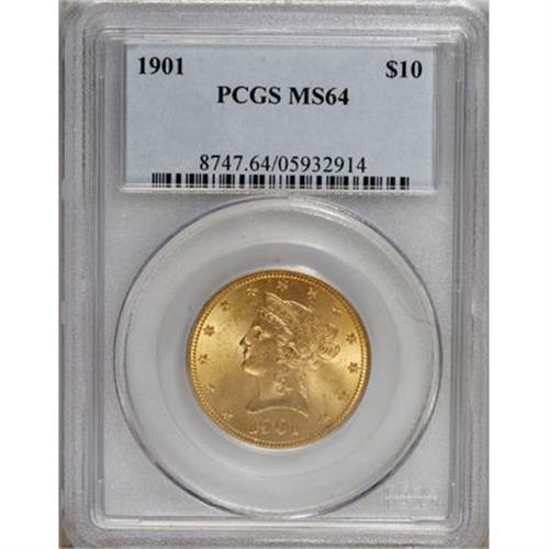 <B>1901 $10 MS64 PCGS.</B></I> A lustrous and impressively preserved green-gold Choice Liberty ten with pleasing eye appeal for the designated grade.<BR><BR><b>Shipping:</b> Coins & Currency (<a target="_blank" href="http://www.heritageauctions.com/common/shipping.php">view shipping information</a>)
