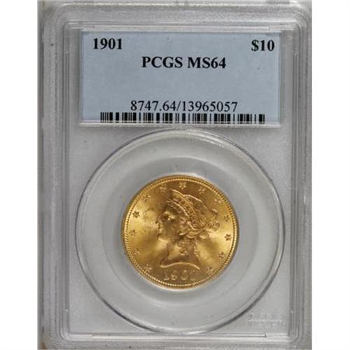 <B>1901 $10 MS64 PCGS.</B></I> Tremendous mint luster radiates from both sides of this near-Gem gold eagle. The bright surfaces display lovely yellow-gold coloration. A few scattered abrasions limit the grade. <BR><BR><B>Coin Engraver:</B> Christian Gobrecht<BR><BR><b>Shipping:</b> Coins & Currency (<a target="_blank" href="http://www.heritageauctions.com/common/shipping.php">view shipping information</a>)