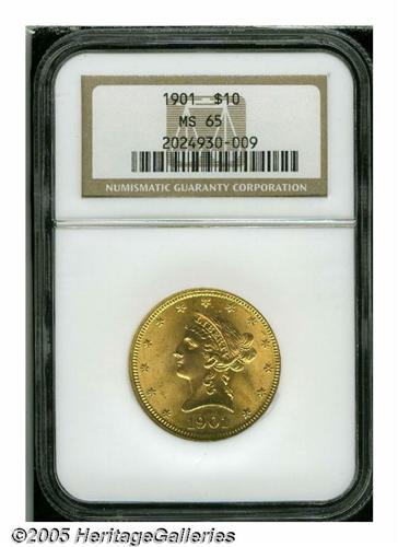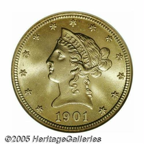 <B>1901<$10> MS65 NGC.</B></I> An absolute Gem of a coin with bright flowing luster and virtually no discernible marks. Sharp and most attractive. A perfect example for a high grade type collection.
