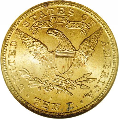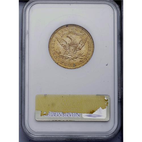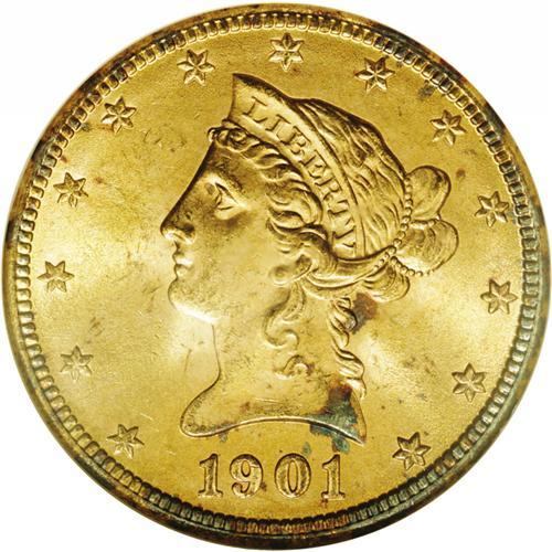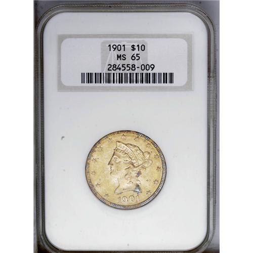 <B>1901<$10> MS65 NGC.</B></I> An original peach-gold Liberty eagle with a few splashes of electric-blue toning on the shoulder and obverse rim. A slender impression on the reverse rim at 10:30 appears to be a strike-through of mint origin. Encapsulated in an older generation NGC holder. <BR><BR><B>Important notice:</B> Heritage usually auctions material at the rate of 200-250 lots per hour. On some occasions eBay Live bid software or the Internet may not be able to keep up with the pace of the auction. We recommend placing a realistic absentee bid now as insurance to avoid disappointment. Occasionally the auctioneer may eliminate or reject an eBay Live bid, and the auctioneer may also reopen a lot after the close of the eBay live bidding (usually because we missed an audience bid), and may reject your bid even if it shows you as the winning bidder. By bidding via eBay Live, you agree that Heritage may award the lot to another bidder at its sole discretion under the circumstances described above or any other reasonable circumstances. Since eBay bids are not shown to us until we open the lot on the floor, we treat those bids just like floor bids. In most cases the floor responds before the eBay bid is presented to us, due to Internet lag time, so for consistency we have made it a policy that floor bids are always considered first over tie eBay live bids. Also please note that all Heritage lots purchased through eBay Live carry a 20% Buyer's Premium. Please make sure you read the Terms and Conditions before you bid. This lot is being auctioned in conjunction with a live floor auction by Heritage Galleries & Auctioneers. All final auction and invoice information will be supplied by Heritage Galleries & Auctioneers, and all other information should be considered preliminary. Lot:4067 <BR><BR><B>Winning Notification and Billing:</B> After the FINAL session in this auction is complete, Heritage will send e-mail and snail mail invoices. This process normally takes several days. All final auction and invoice information will be supplied by Heritage Galleries & Auctioneers, and all other information should be considered preliminary. <BR><BR>This auction will be conducted on a live auction floor and over the Internet through eBay Live. If you choose to place an absentee bid, please take a moment to <font color='#0000ff'><u><a href='http://pages.ebay.com/liveauctions/help/before/laabsentee.html'>learn how eBay Live absentee bidding works</a></u></font><font color='#000000'>