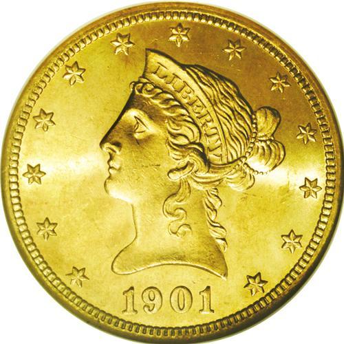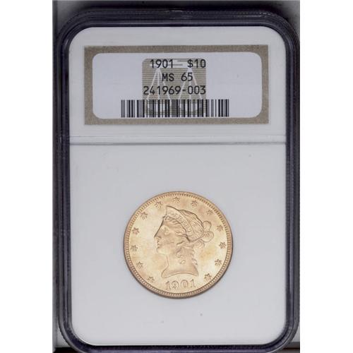 <B>1901<$10> MS65 NGC.</B></I> Beautiful reddish peach-gold toning envelopes the shimmering surfaces of this well struck Gem. All of the design elements are fully delineated and surface marks are minimal.