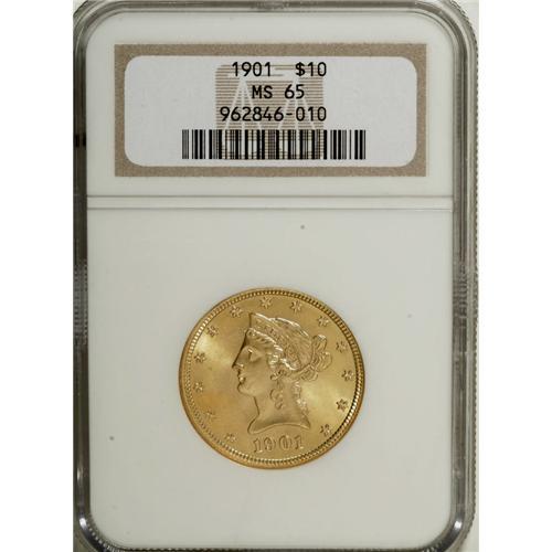 <B>1901 $10 MS65 NGC.</B></I> The gorgeous, pristine surfaces instantly convey Gem quality, and subsequent perusal only confirms that impression. The strike is almost full, there is no field haze, singular abrasions are nonexistent--save for one tick on Liberty's cheek--and radiant cartwheel luster drips from the surfaces. Enormously appealing, and worthy of strong bidding.<BR><BR><b>Shipping:</b> Coins & Currency (<a target="_blank" href="http://www.heritageauctions.com/common/shipping.php">view shipping information</a>)