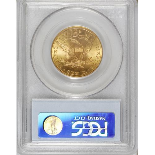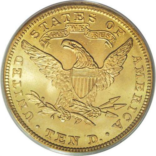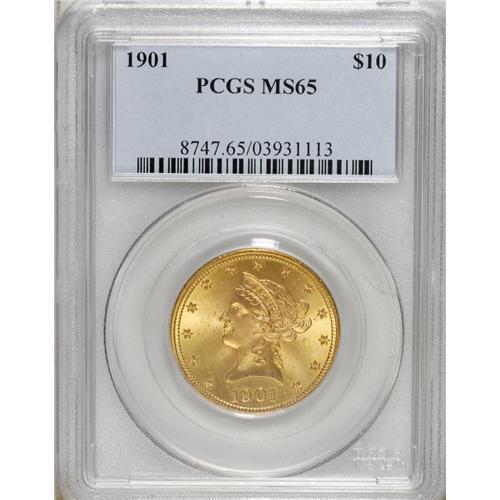 <B>1901 $10 MS65 PCGS.</B></I> Relatively large quantities of the 1901 1.718 million-piece mintage survives today, largely resulting from repatriation of coins from European bank hoards (Jeff Garrett and Ron Guth, 2006). As close to 800 MS65 examples have been certified, type collectors gravitate to this date for the excellent value it offers in high grades. The current Gem displays lustrous green-gold surfaces that are relatively well preserved. A well executed strike has left sharp definition on the design elements.<BR><BR><b>Shipping:</b> Coins & Currency (<a target="_blank" href="http://www.heritageauctions.com/common/shipping.php">view shipping information</a>)