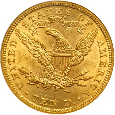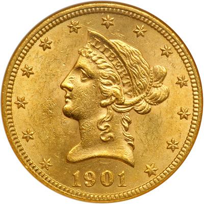 1901 $10. NGC graded MS-62. Attractive lustrous surfaces and lovely subtle golden shades.