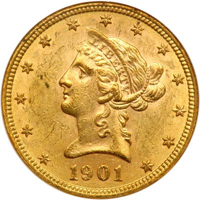 1901 $10. NGC graded MS-62. Lightly toned. Has the usual bagmarks in the fields.