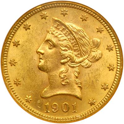 1901 $10. NGC graded MS-62. Lovely subtle golden toning on both sides.