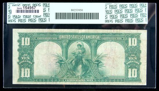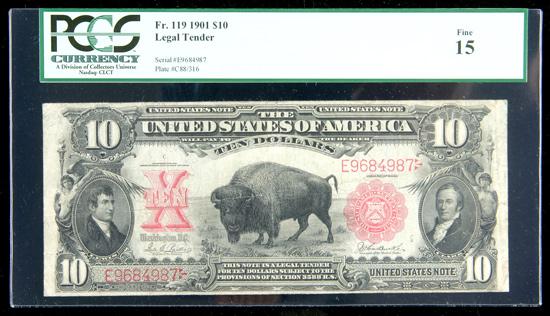 1901, $10 United States Note. PCGS Fine 15. . Fr-119. . KL-385. Bison notes are ever-popular among collectors, and this sale features several nice circulated examples from which to choose. There are no major flaws visible on this attractive example.