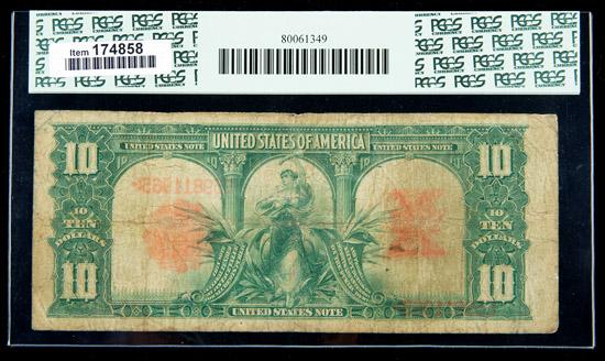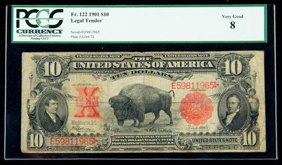 1901, $10 United States Note. PCGS Very Good 8. . Fr-122. This Bison note is well circulated, but the paper remains intact and there are no major flaws.