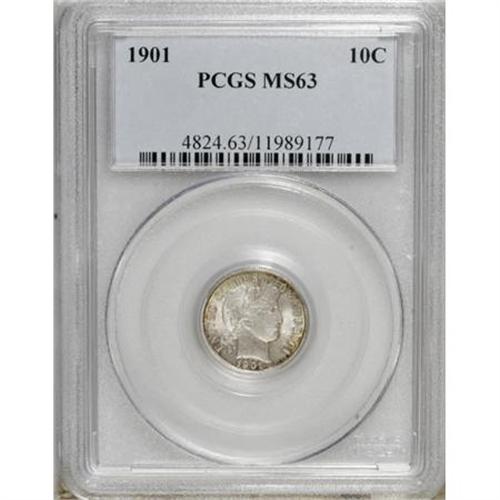 <B>1901 10C MS63 PCGS.</B></I> . PCGS Population (81/119). NGC Census: (51/105). Mintage: 18,860,478. Numismedia Wsl. Price for NGC/PCGS coin in MS63: $144. (#4824)<BR><BR><B>Coin Engraver:</B> Charles E. Barber<BR><BR><b>Shipping:</b> Coins & Currency (<a target="_blank" href="http://www.heritageauctions.com/common/shipping.php">view shipping information</a>)