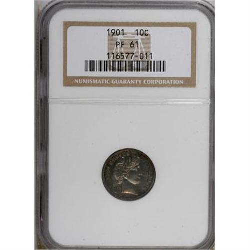 <B>1901 10C PR61 NGC.</B></I> NGC Census: (7/186). PCGS Population (3/169). Mintage: 813. Numismedia Wsl. Price for NGC/PCGS coin in PR61: $250. (#4885)<BR><BR><B>Coin Engraver:</B> Charles E. Barber<BR><BR><b>Shipping:</b> Coins & Currency (<a target="_blank" href="http://www.heritageauctions.com/common/shipping.php">view shipping information</a>)