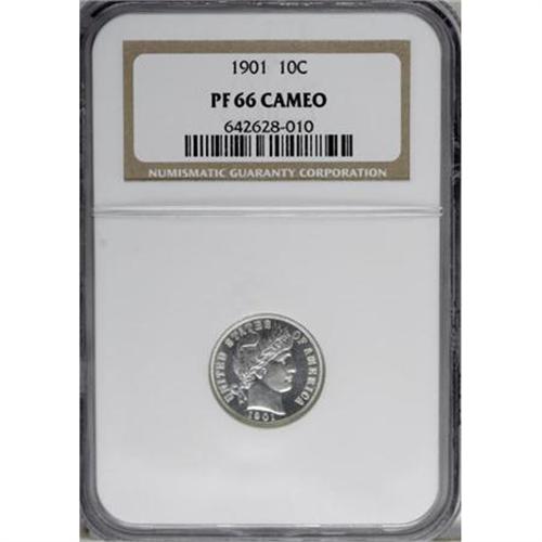 <B>1901 10C PR66 Cameo NGC.</B></I> Intricately detailed with watery fields and nicely frosted devices. Pleasing cameo contrast emerges on each side of the piece. Census: 8 in 66 Cameo, 7 finer (12/07).<BR><BR><b>Shipping:</b> Coins & Currency (<a target="_blank" href="http://www.heritageauctions.com/common/shipping.php">view shipping information</a>)