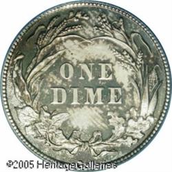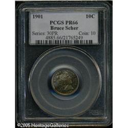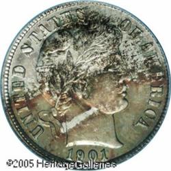 <B>1901 10C PR66 PCGS.</B></I> Blushes of honey and rose color invigorate the lower obverse, while swaths of golden-brown and cobalt-blue patina encompass much of the reverse. Although the uppermost cereal grains are not fully struck, as is also the case with a few obverse dentils near 7 o'clock, the strike is otherwise bold. An unmarked specimen, desirable due to its quality and its small production of a mere 813 pieces. Population: 21 in 66, 6 finer (1/05).<BR><I>From the Bruce Scher #1 All-Time PCGS Registry Set.</B></I> Lot:4061