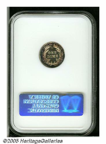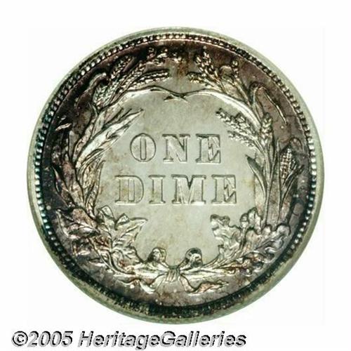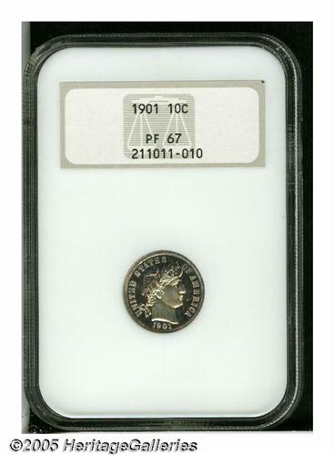 <B>1901<10C> PR67 NGC.</B></I> A mere 813 proofs were struck of this popular turn-of-the-century issue. The surfaces are virtually flawless with no blemishes or hairlines apparent on either side. Both sides are similar in hue with brilliant centers bordered with reddish-russet and sea-green colorations. An original, unmarked Superb example. Population: 12 in 67, 2 finer (4/05).