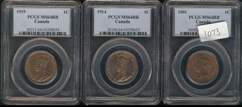 1901, 1914, 1919 all three pieces are graded PCGS MS64 red/brown. Nice lot!
