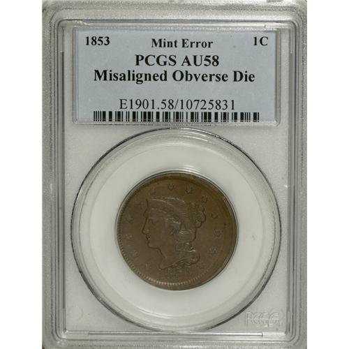 <B>1853 1C --Misaligned Obverse Die-- AU58 PCGS.</B></I> Population: 45 in 58, 425 finer (2/07). Census: 97 in 58, 729 finer (2/07).(#1901)<BR><BR><b>Shipping:</b> Coins & Currency (<a target="_blank" href="http://www.heritageauctions.com/common/shipping.php">view shipping information</a>)