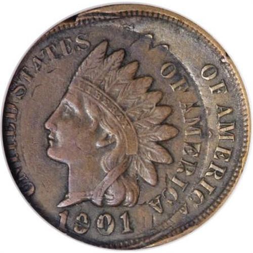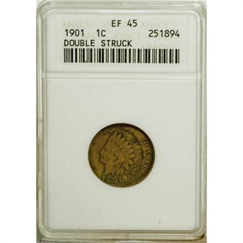 <B>1901 1C Indian Cent--Double Struck--XF45 ANACS.</B></I> The first strike was normal, the second strike is 10% to 15% off center toward 9:30, positioned at 8:30 relative to the initial strike. The date from the second strike is sharp, and the final 1 from the first strike is faintly evident. A lilac-brown example of this popular error type.<BR><BR><B>Coin Engraver:</B> James B. Longacre<BR><BR><b>Shipping:</b> Coins & Currency (<a target="_blank" href="http://www.heritageauctions.com/common/shipping.php">view shipping information</a>)