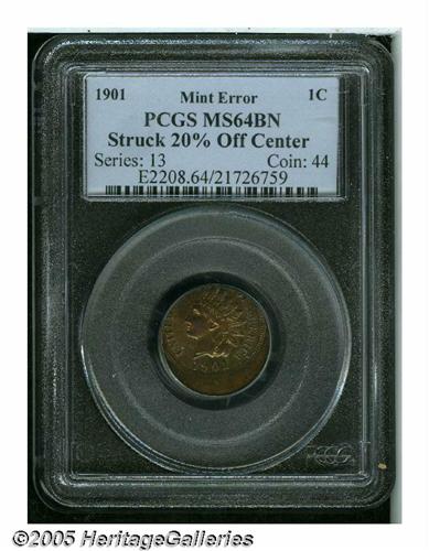 <B>1901<1C> Indian Cent--Struck 20% Off Center--MS64 Brown PCGS.</B></I> Struck decisively off center toward 11:30, nearly all of STATES is off the flan. A lustrous and carefully preserved representative that has vivid lime and honey-gold colors. If anyone is up to the challenge of an Uncirculated set of off centered Indian Cents, the present piece will be an entry into a formidable collection.<BR><I>From The Larry Rausch Collection of Errors, Part Four.</B></I>