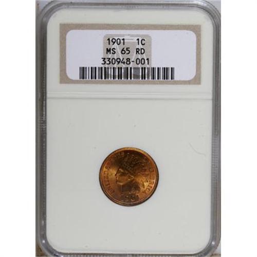<B>1901 1C MS65 Red NGC.</B></I> NGC Census: (102/30). PCGS Population (174/51). Mintage: 79,611,144. Numismedia Wsl. Price for NGC/PCGS coin in MS65: $420. (#2210)<BR><BR><b>Shipping:</b> Coins & Currency (<a target="_blank" href="http://www.heritageauctions.com/common/shipping.php">view shipping information</a>)