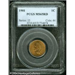 1901 1C MS65 Red PCGS. Nice luster is found beneat <B>1901 1C MS65 Red PCGS.</B></I> Nice luster is found beneath golden-orange color. Sharply struck on the design elements. A couple of minor ticks are noted on the Indian's cheek. <BR><BR><B>Important notice:</B> Heritage usually auctions material at the rate of 200-250 lots per hour. On some occasions eBay Live bid software or the Internet may not be able to keep up with the pace of the auction. We recommend placing a realistic absentee bid now as insurance to avoid disappointment. Occasionally the auctioneer may eliminate or reject an eBay Live bid, and the auctioneer may also reopen a lot after the close of the eBay live bidding (usually because we missed an audience bid), and may reject your bid even if it shows you as the winning bidder. By bidding via eBay Live, you agree that Heritage may award the lot to another bidder at its sole discretion under the circumstances described above or any other reasonable circumstances. Since eBay bids are not shown to us until we open the lot on the floor, we treat those bids just like floor bids. In most cases the floor responds before the eBay bid is presented to us, due to Internet lag time, so for consistency we have made it a policy that floor bids are always considered first over tie eBay live bids. Also please note that all Heritage lots purchased through eBay Live carry a 20% Buyer's Premium. Please make sure you read the Terms and Conditions before you bid. This lot is being auctioned in conjunction with a live floor auction by Heritage Galleries & Auctioneers. All final auction and invoice information will be supplied by Heritage Galleries & Auctioneers, and all other information should be considered preliminary. Lot:5106
