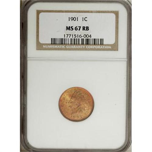 <B>1901 1C MS67 Red and Brown NGC.</B></I> Spectacular orange, red, and lime-green colors illuminate this gorgeous and lustrous Superb Gem. Exceptionally preserved, and well struck aside from the upper right corner of the shield. A die break (as made) is noted near the right pendant of the T in CENT. Those who prefer eye appeal to color designations on holders should strongly consider the present lot.<BR><I>From The New York Eye Appeal Collection, Part Three.</B></I><BR><BR><B>Coin Engraver:</B> James B. Longacre<BR><BR><b>Shipping:</b> Coins & Currency (<a target="_blank" href="http://www.heritageauctions.com/common/shipping.php">view shipping information</a>)