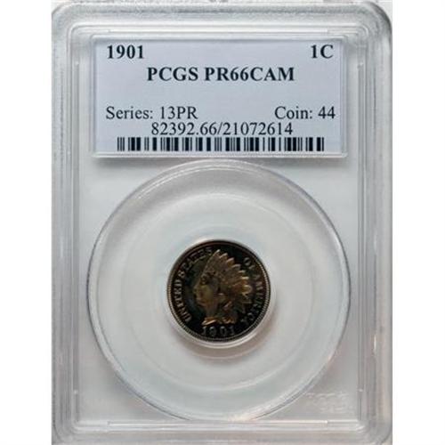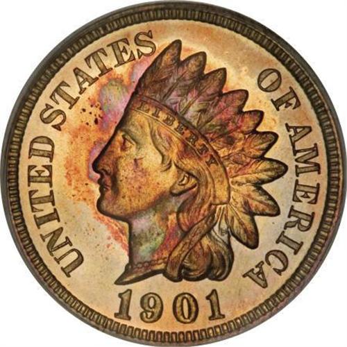<B>1901 1C PR66 Cameo PCGS.</B></I> The peripheries are greenish-tan, with a wild central mélange of magenta, gold, and ice-blue. Despite the intense color, the field-device contrast is sufficient for the Cameo designation. The reverse offers a more moderate color palette. A sharp, alluring, near-carbon-free specimen. Population: 3 in 66 Red, 0 finer (12/07).<BR><BR><b>Shipping:</b> Coins & Currency (<a target="_blank" href="http://www.heritageauctions.com/common/shipping.php">view shipping information</a>)