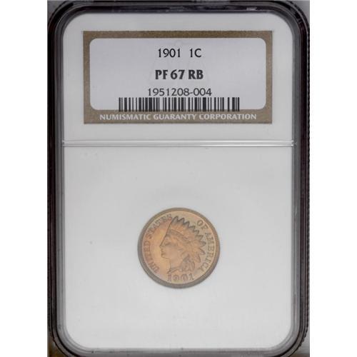 <B>1901<1C> PR67 Red and Brown NGC.</B></I> Bright proof surfaces exhibit orange-gold coloration in the obverse center that is framed by peripheral olive-green, while the reverse is a deep crimson. Exquisitely struck on the motifs, and devoid of mentionable contact marks or unsightly spots. Census: 9 in 67, 0 finer (2/06).