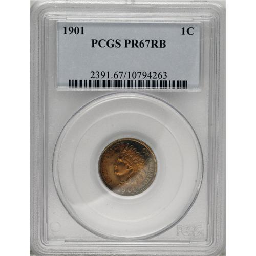 <B>1901 1C PR67 Red and Brown PCGS.</B></I> This multicolored Superb Red and Brown proof 1901 cent is dominated by orange-gold on the obverse, with blushes of olive-green along the right border, and displays a couple of shades of vivid crimson, accented by sky-blue on the reverse. Impeccably preserved surfaces reveal exquisitely struck design elements. Population: 5 in 67 Red and Brown, 0 finer (1/07).<BR><BR><b>Shipping:</b> Coins & Currency (<a target="_blank" href="http://www.heritageauctions.com/common/shipping.php">view shipping information</a>)
