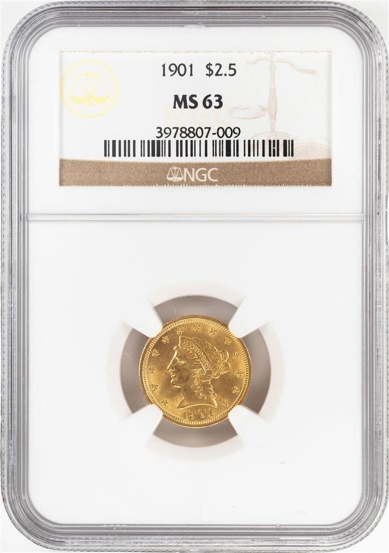One 1901 $2 1/2 Liberty Head Quarter Eagle Gold Coin NGC MS63. NGC Certified.