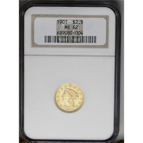1901 $2 1/2 MS62 NGC. Softly lustrous, with light stra