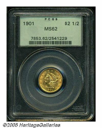 <B>1901<$2 1/2> MS62 PCGS.</B></I> Meticulously struck, and not unpleasantly marked for the grade. The base of the second 1 in the date is lightly repunched. Encapsulated in a prior generation holder.